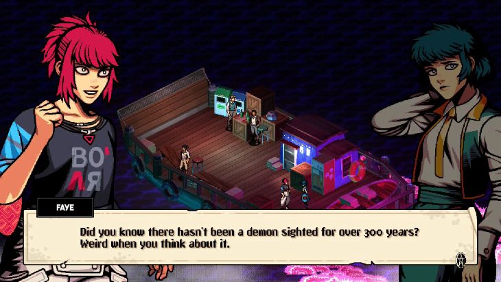 Demonschool mixes 2D pixel graphics with 3D environments, with the two styles mixing very well together. While the environments during battle tend to stay the same when dealing with mobs, all of the locations on the island are unique, from the town center to the graveyard to the harbor. And the stages when fighting against bosses lean into their design, resulting in some pretty gnarly set designs. The island gives a homey feel, if you ignore all of the demons that are crawling in the shadows. The character designs are just cool, each character having a multitude of sprites depending on their feelings at a point in time. And the UI helps to bring everything together, resulting in a satisfying visual experience.